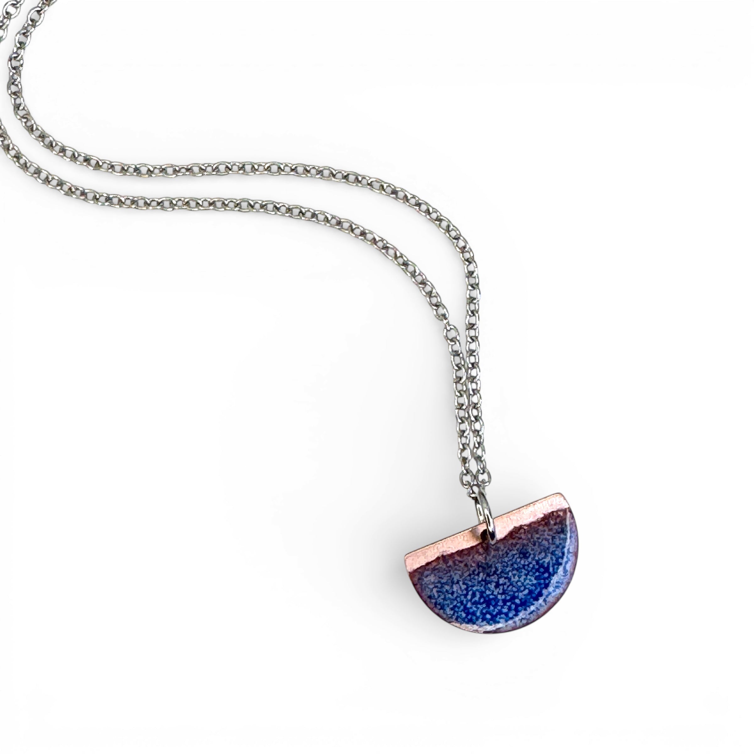 Measures: This enameled copper necklace is 1/2" and it hangs on an 18" stainless steel chain.